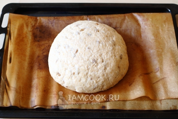 Обминаем его руками, при необходимости подсыпая немного муки, формируем приплюснутый шар и перекладываем на противень с пекарской бумагой. Оставляем снова под полотенцем в теплом месте на 20-30 минут.