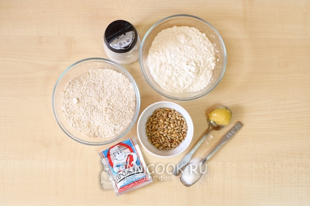 Готовить будем из смеси пшеничной и овсяной муки. Последнюю я готовлю сама из овсяных хлопьев с помощью верного помощника – блендера. И вам советую поступить так же. Какую овсянку взять – дело ваше. Много мнений на этот счёт; самое популярное - что хлопья для варки от 10 минут - лучше и полезнее, чем быстроразваривающиеся. Как по мне, так из последних просто мука будет более мелкая. Остальные ингредиенты для приготовления овсяного хлеба в духовке вы видите на фото. Мы приступаем!