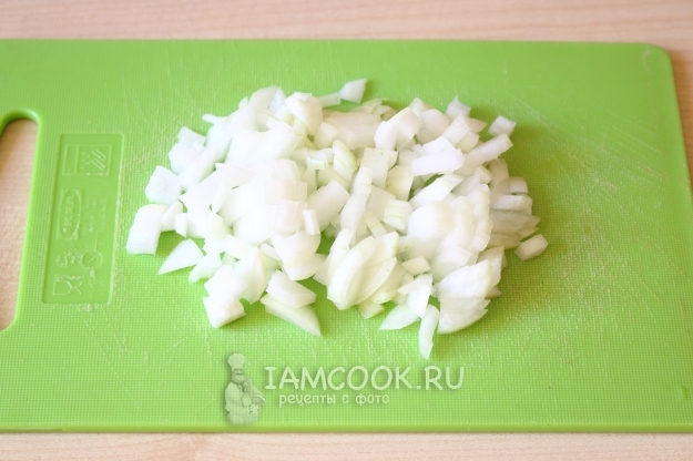 Пока рис варится, подготовим овощи. Лук нарезаем мелким кубиком.