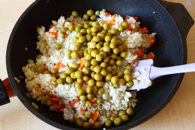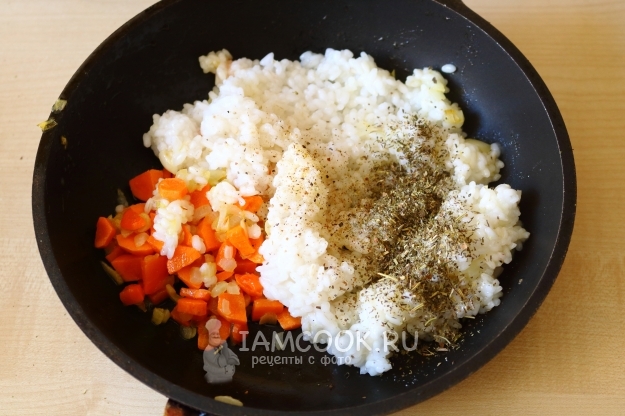 Перекладываем к поджарке готовый рис, всыпаем соль, перец и «Прованские травы» по вкусу.