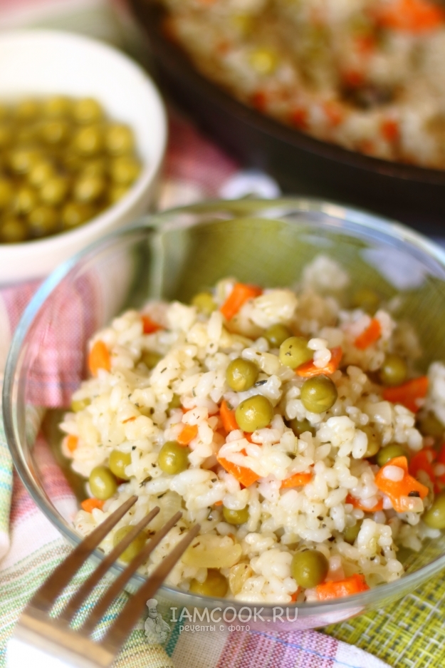 Рис с консервированным зелёным горошком – это очень питательное, лёгкое и вкусное кушанье. Я готовлю его на гарнир к рыбным блюдам. Но оно может стать и полноценным обедом или ужином, в частности если вы вегетарианец или веган. Помимо риса и горошка я использую в приготовлении овощи – для сочности блюда. И как всегда – любимую приправу, что делает гарнир необычайно ароматным. Наши ингредиенты готовы, приступаем!