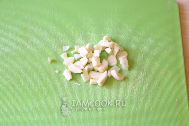Чеснок режем на мелкие кусочки, можно измельчить с помощью пресса.