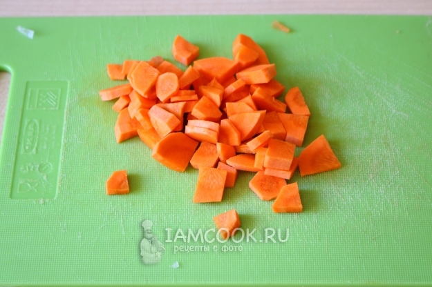 Морковь - небольшими кругами, полукругами или четвертинками, в зависимости от диаметра морковки.