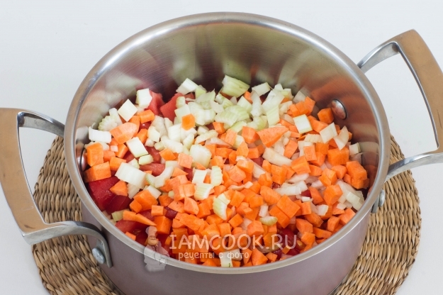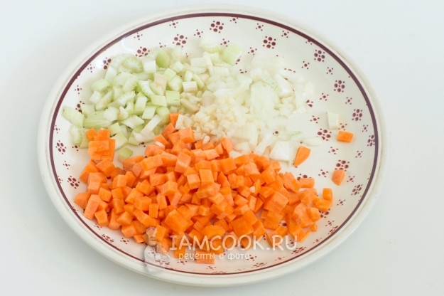 Нарежьте некрупными кубиками очищенную морковь, сельдерей и половину лука с чесноком.