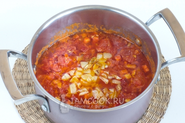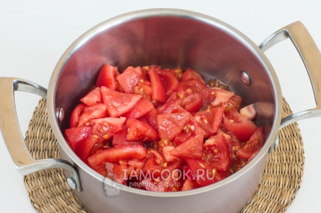 Помидоры обдайте кипятком, удалите шкурку, а мякоть нарежьте небольшими ломтиками. Положите измельченные помидоры в кастрюлю.
