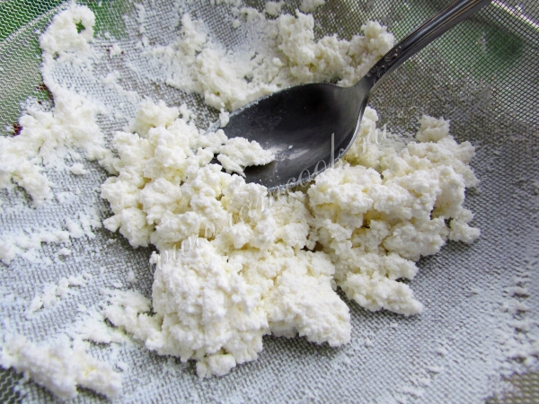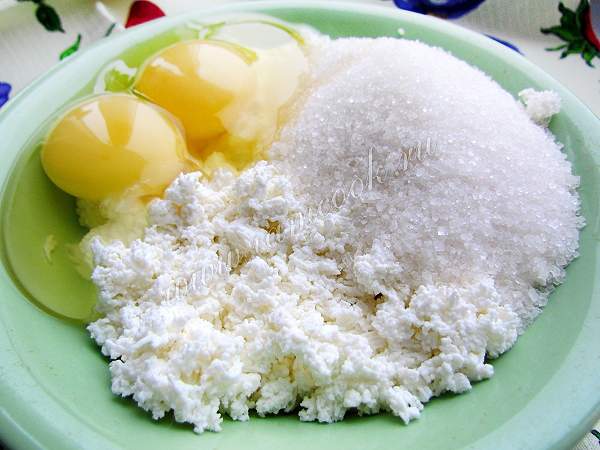 Добавьте в протертый творог яйца и сахар. Перемешайте.