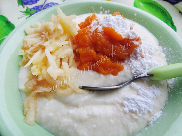 Соедините творожно-яичную массу, тыквенное пюре и яблоко. Добавьте крахмал, хорошо перемешайте.