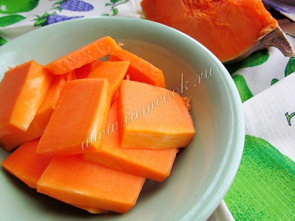 Тыкву очистите от семян и кожуры, нарежьте тонкими пластинами и запеките в духовке до мягкости около 15 минут при температуре 200 градусов.