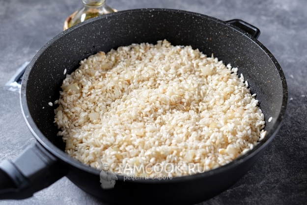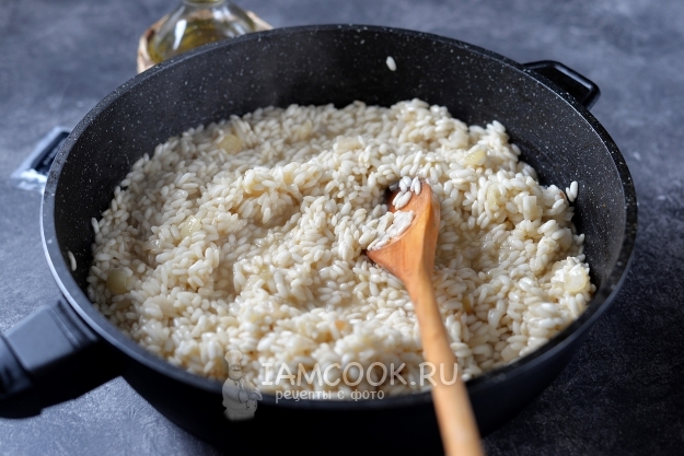 Всыпьте рис арборио, для ризотто рис не промывают. Постоянно перемешивайте, нужно чтобы все рисины пропитались маслом. Влейте вино, дайте ему выпариться немного.