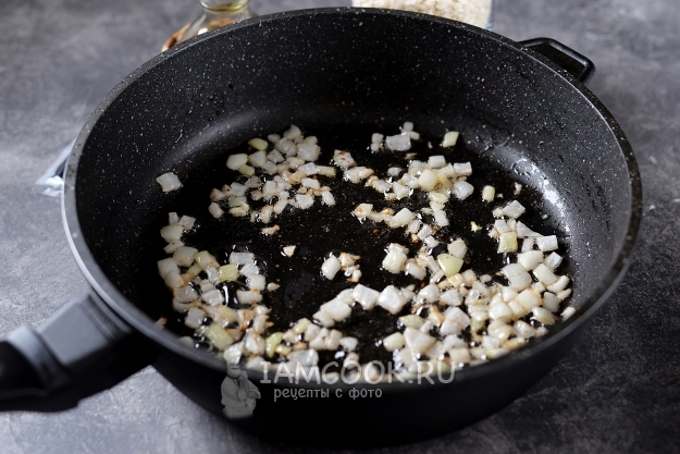 В это же масло всыпьте мелко нарезанный репчатый лук, обжарьте его до сладкого состояния и прозрачного цвета.