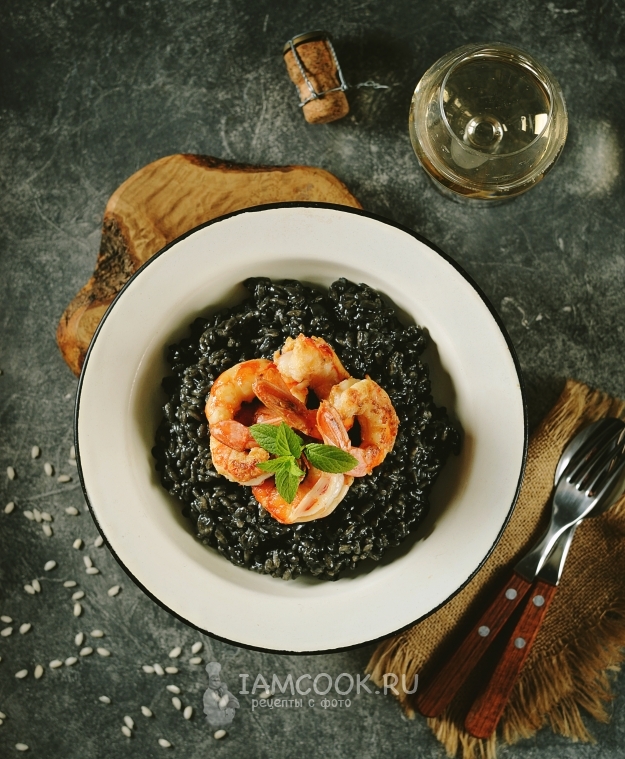 Разложите ризотто с чернилами каракатицы по порциям, сверху положите несколько хвостов обжаренных лангустинов, украсьте блюдо свежей зеленью и подавайте с бокалом сухого белого.