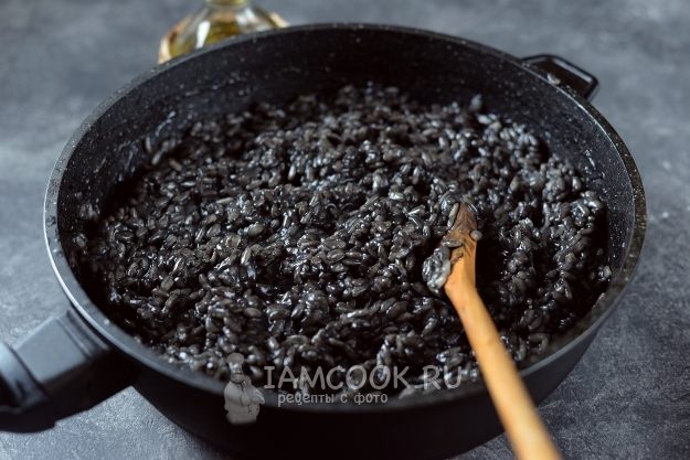 Последними влейте чернила осьминога-каракатицы, быстро перемешайте. Солить блюдо, скорее всего, не понадобится, поскольку бульон, чернила и пармезан достаточно соленые. Продолжайте подливать бульон, консистенция ризотто должна быть кремовой.