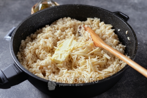 Когда рис будет почти готов, положите натертый пармезан и сливочное масло, растворите их полностью, помешивая.