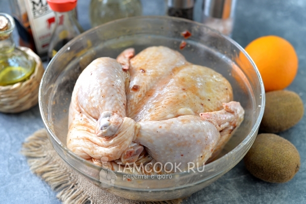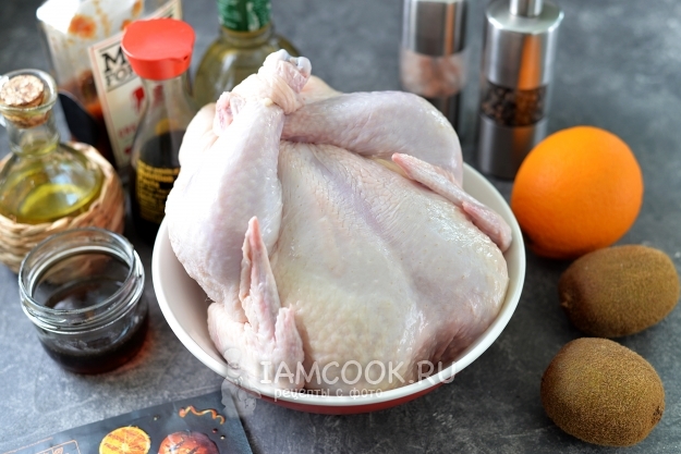 Продукты для приготовления запеченной курицы с киви и апельсинами подготовьте по списку ингредиентов. Курицу тщательно помойте снаружи и внутри под проточной водой.