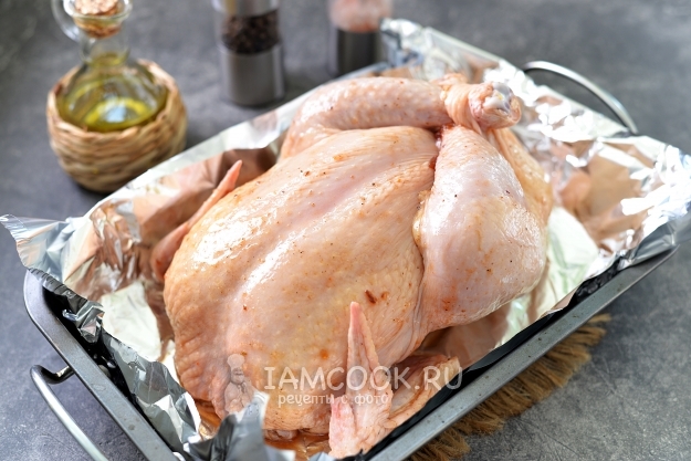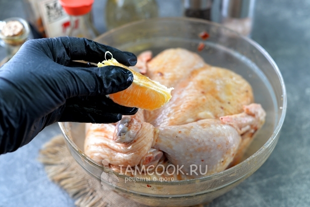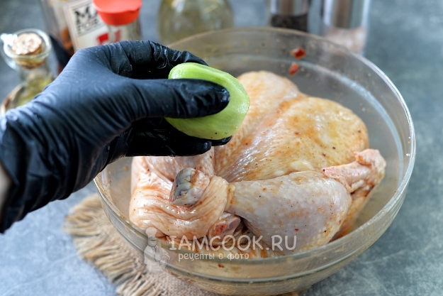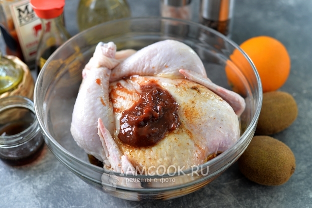 Натрите хорошенько маринадом тушку птицы снаружи и внутри.