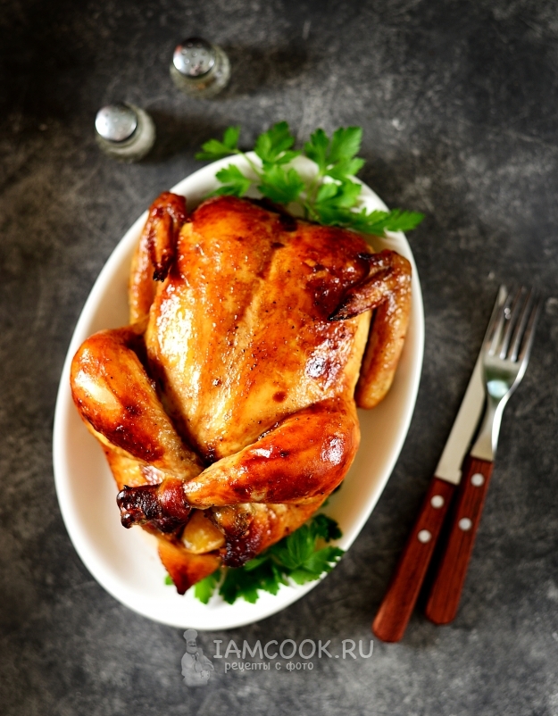 Переложите птицу в форму для запекания, отправьте ее в предварительно разогретую до 180 градусов духовку на час-полтора. Крылышки лучше сразу замотать в пищевую фольгу, чтобы не сгорели. Время от времени поливайте курочку оставшимся маринадом.