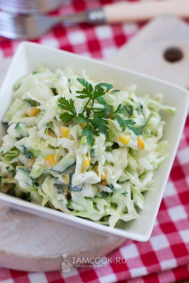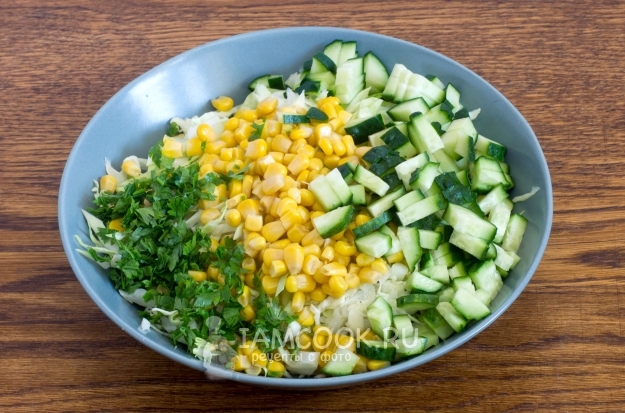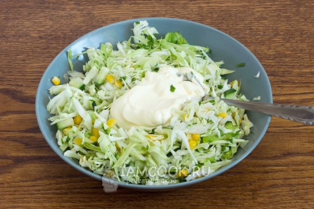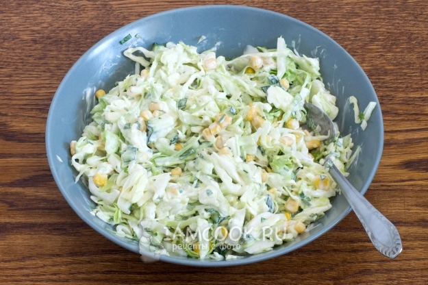 Перемешайте и подавайте к столу - салат из молодой капусты с кукурузой готов.