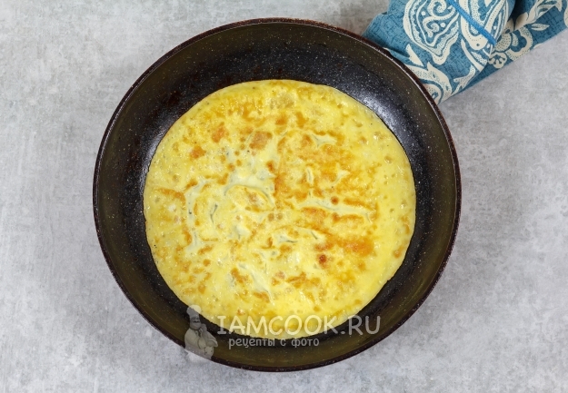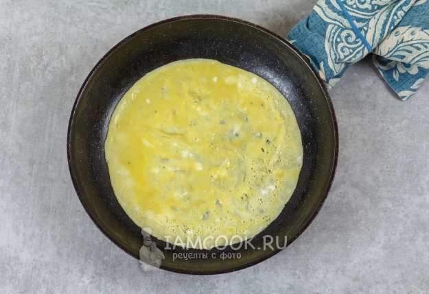 Разогрейте сковороду (лучше всего антипригарную) на среднем или чуть ниже среднего огне и смажьте тонким слоем растительного масла. Отмерьте в сковороду порцию яичной смеси, достаточную для того чтобы покрыть дно тонким слоем (для сковороды диаметром 24 см мне понадобилось примерно 3 ст.л.). Обжарьте получившийся яичный блинчик 1-1.5 минуты с одной стороны, пока яичная масса не загустеет.