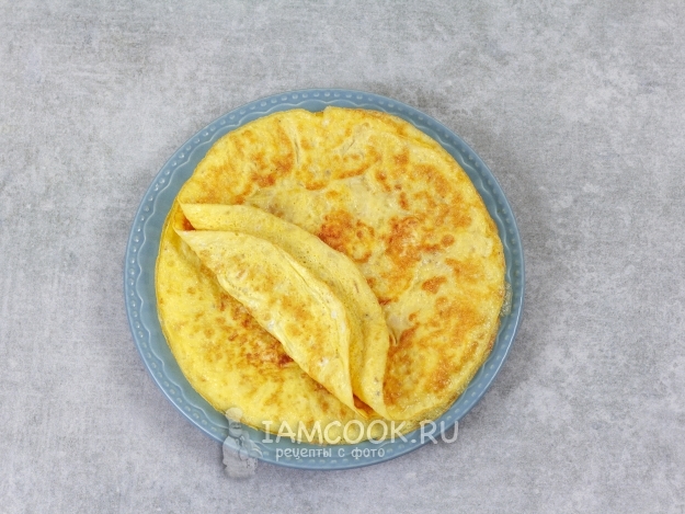 Переложите готовый яичный блинчик на тарелку и повторите процесс с оставшейся смесью.