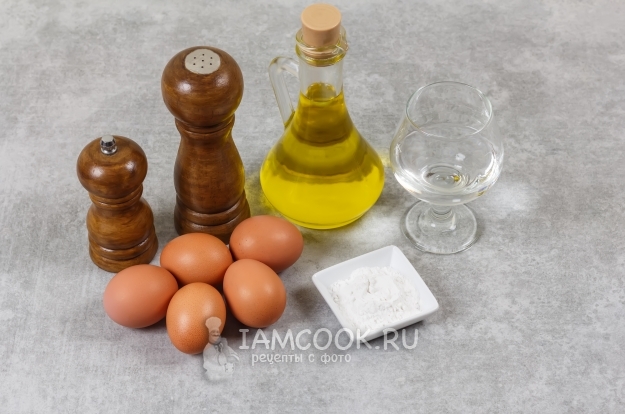 Подготовьте ингредиенты. Количество корректируйте по своему вкусу. В данном случае будем готовить 5 яичных блинчиков, поэтому в соответствии с формулой возьмем: 5 яиц, 5 ст.л. холодной воды, 5 ч.л. (без горки) крахмала, а также соль, молотый черный перец и растительное масло.
