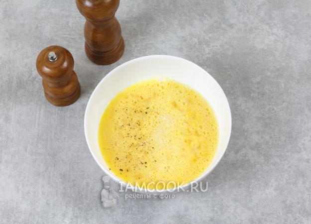 В получившуюся смесь яиц, воды и крахмала добавьте по вкусу немного соли и молотого черного перца. Еще раз все хорошо перемешайте.