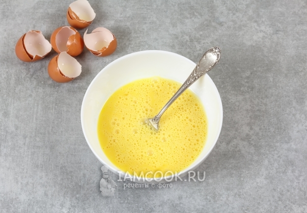 Разбейте в миску куриные яйца и слегка взбейте их вилкой, для того чтобы белки и желтки смешались.