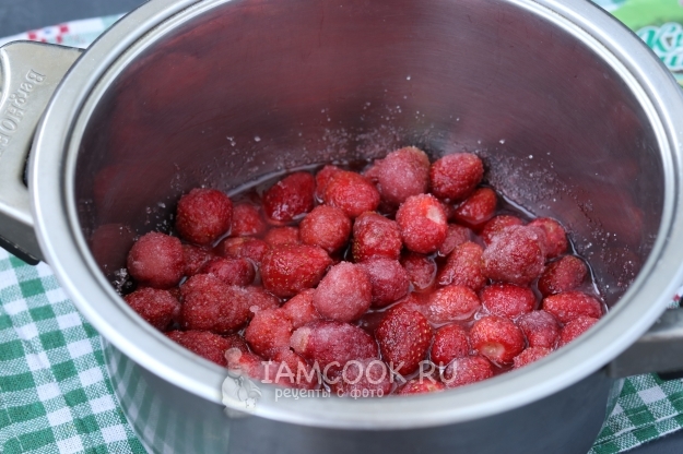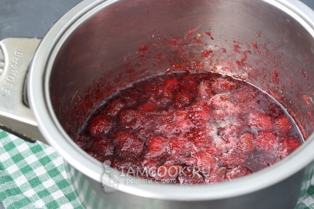 Оставить на 3-4 часа, пока клубника не пустит сок. Затем поставить на огонь, дать сахару раствориться полностью и варить 5 минут, помешивая. Оставить варенье полностью остыть.
