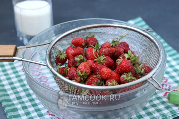 Клубнику промыть холодной водой, поместить в сито, чтобы ушла лишняя вода. Затем можно промокнуть бумажными полотенцами.