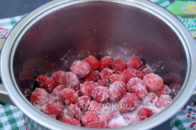 Подготовить кастрюлю, в которой планируете варить варенье, переложить в неё ягоды и засыпать сахаром.