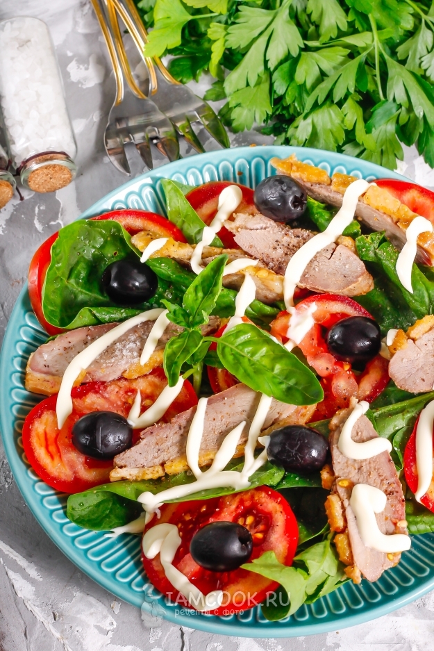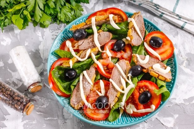 Добавьте маслины или оливки, украсьте майонезом или другим соусом по вкусу.