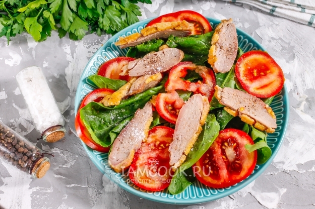 Если у вас есть в наличии запеченная или обжаренная утиная грудка, обязательно приготовьте из нее сочный салат, добавляя различные овощи и зелень. Такое блюдо можно подать как на обед, так и на ужин, главное - грудка должна быть теплой. Для этого ее можно запечь или обжарить заранее, а затем лишь подогреть, но помните, что прожарка мяса должна быть практически Well done («вел дан»). Для овощной подушки используйте помидоры, шпинат, красный лук, зеленый лук, болгарский перец, огурцы и т.д.