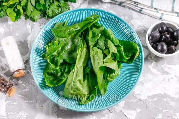 Промойте листья шпината, срежьте стебли, стряхните лишнюю влагу и выложите на тарелку.