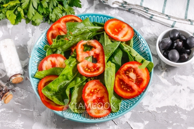 Промойте помидор, нарежьте его кружочками, вырезая сердцевину, выложите на листья шпината.