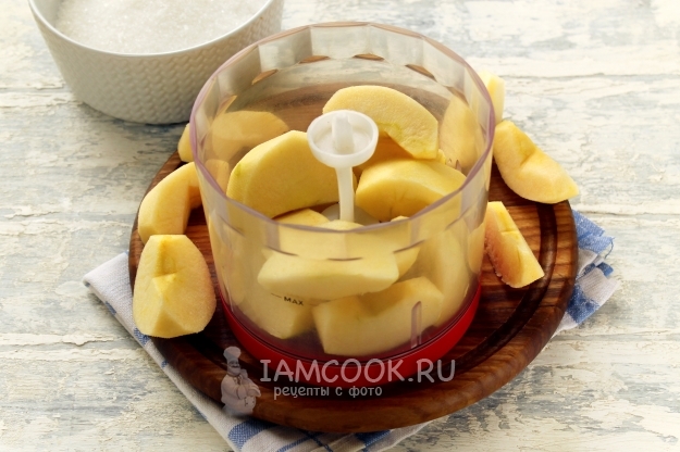 Хотите - натрите крупной стружкой в комбайне или на ручной терке. Но можно поступить иначе, согласно нашему пошаговому рецепту: опустите дольки в контейнер измельчителя с насадкой "нож". Важно сохранить фактуру, зернистость, порубить мелко, не достигая гомогенного пюре.