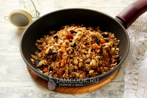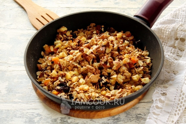 Подсушивают геркулес как в духовке, так и на верхнем огне плиты. Если порция невелика, удобнее использовать сковороду и орудовать на конфорке. Если же запасаетесь большими объемами гранолы, сушите на противне в печи. В любом случае, последовательность закладки продуктов сохраняется.