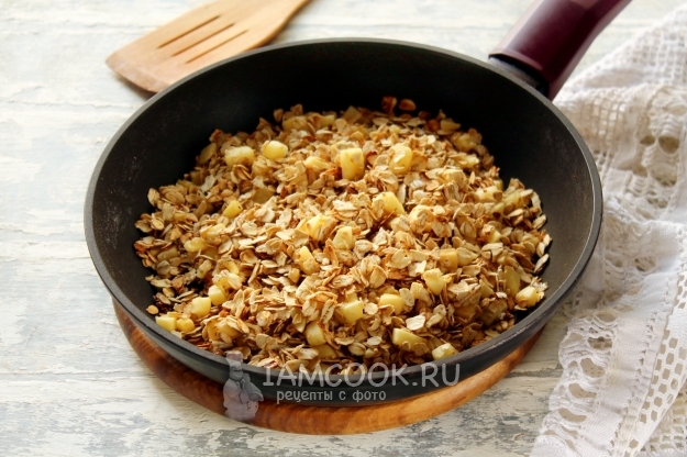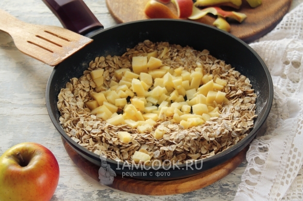Для свежести, фруктовой сочности добавляем яблоко. Очистив от кожуры, нашинковав мелкими кубиками, бросаем к овсянке с пудрой. Продолжаем мешать и подсушивать следующие 10 минут. При желании яблоки заменяют грушами, айвой, косточковыми (персиками, абрикосами, сливами, черешней, вишней). Следите, чтобы нижние слои не подгорали, и часто перемешивайте.
