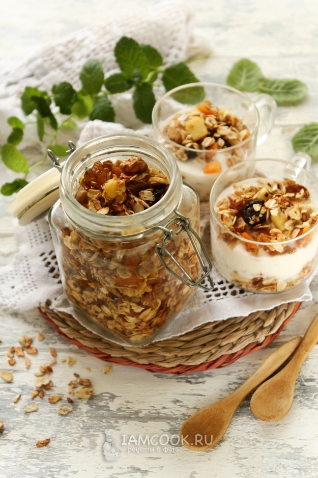 Разнообразим рацион и вместо привычной каши пополним запасы полезной, вкусной, многокомпонентной гранолой — сухой смеси на основе геркулеса с добавлением свежего яблока, орехов и сухофруктов.