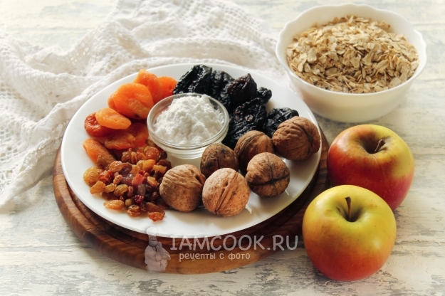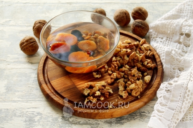 Чернослив, курагу и изюм на 5-10 минут опускаем в плошку с водой (можно в кипяток), затем споласкиваем и рубим. Ядра грецкого ореха дробим разнокалиберными фрагментами. Также годятся вяленые ягоды, цукаты, миндаль, фундук, пекан.