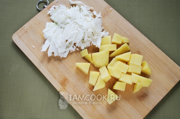 Тем временем подготовьте овощи. Нарежьте кубиком картофель, нашинкуйте свежую капусту.