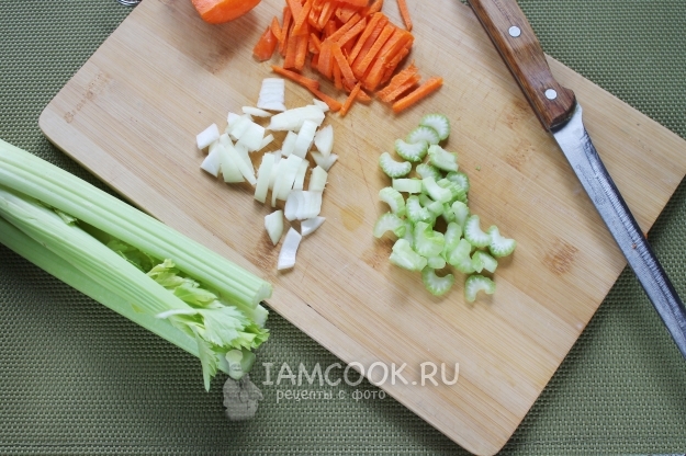 Для заправки мелко нарежьте морковь, сельдерей, лук.