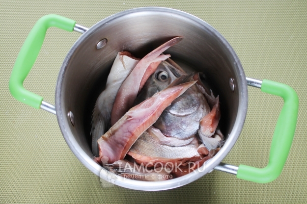 Горбушу очистите от чешуи, выпотрошите, обязательно удалите жабры, хорошо промойте. Отрежьте голову, хвост, плавники, сложите в кастрюлю и залейте водой. Добавьте крупно нарезанную морковь, лук, стебель сельдерея и зелени, используйте третью часть овощной закладки (ингредиентов) для щей. Поставьте кастрюлю на плиту, доведите до кипения, снимите пену и варите рыбу минут 20-25, в зависимости от её размера.