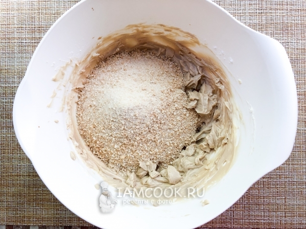Добавьте измельченное печенье в сырную массу и перемешайте до однородной массы. Накройте пищевой пленкой и уберите в холодильник на 30 минут.