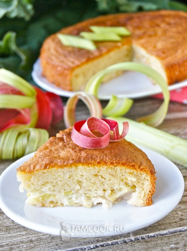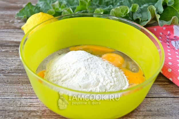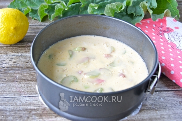 Ревень нарежьте на небольшие кусочки и выложите в тесто, перемешайте.