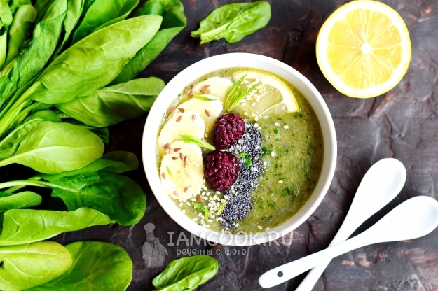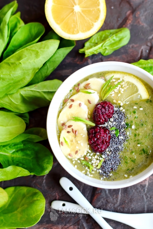 Шпинат обладает нейтральным вкусом, поэтому является великолепным ингредиентом для приготовления смузи. Его можно сочетать как с овощами, так и с фруктами. Предложенный смузи из шпината и огурца получается свежим и бодрящим, при этом очень полезным и вкусным. В качестве подсластителя берем банан, а вот сахар или мед добавлять не нужно. Водной основой может быть цитрусовый сок или вода, при этом в воду лучше добавить сок лимона для балансировки вкуса.