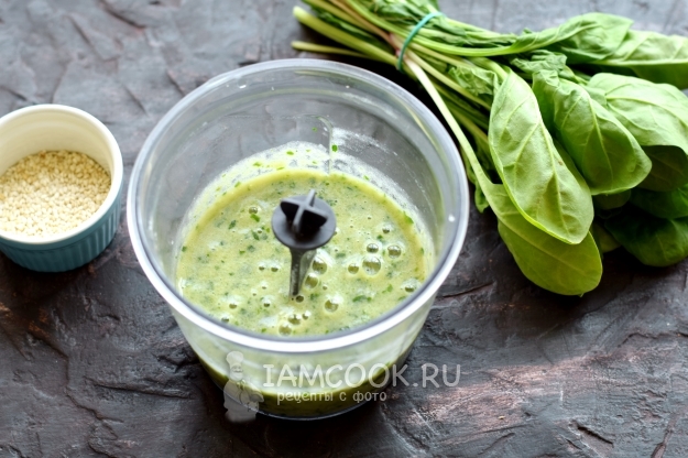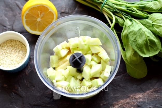 Влейте воду, после перебейте содержимое чаши до получения однородного состава. Добавьте кунжут, выдавите сок из лимона, самостоятельно регулируя вкус смеси.