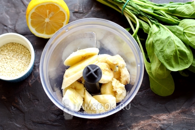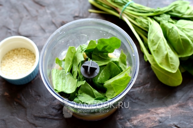 Листья шпината тщательно вымойте, порвите руками, поместите в контейнер. Стебельки лучше не использовать, поскольку они могут полностью не перебиться блендером.