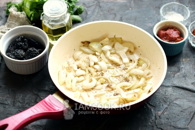 Добавьте к мясу чернослив, его можно разрезать на части или оставить в целом виде. Вместе с черносливом гуляш жарьте еще несколько минут, иногда перемешивая.