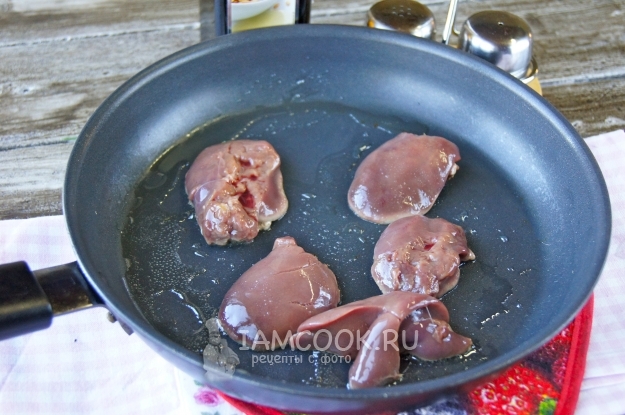 Для начала промойте печенку, удалите пленки, обсушите. Разогрейте сковороду с растительным маслом, выложите кусочки печени и обжарьте с двух сторон на среднем огне, посолите и поперчите.
