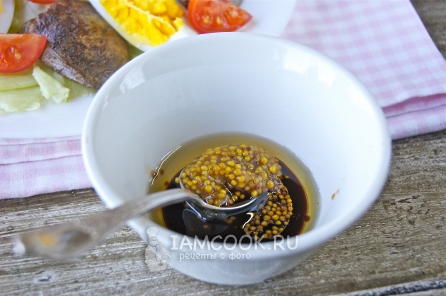 Из кунжутного масла, горчицы и соевого соуса сделайте заправку.