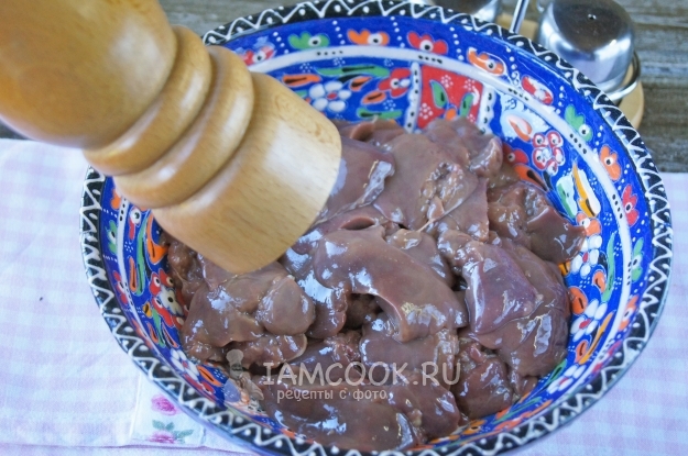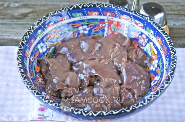 Печень промоем, удалим пленочки, убедимся, что нет желчи, нарежем на средние куски.